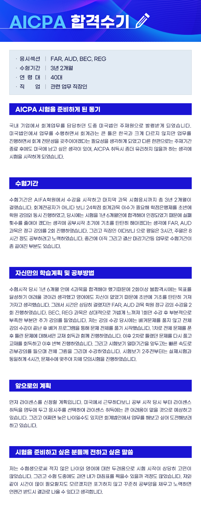 제목 [AICPA] 40대/직장인/약 3년 2개월/전과목 합격