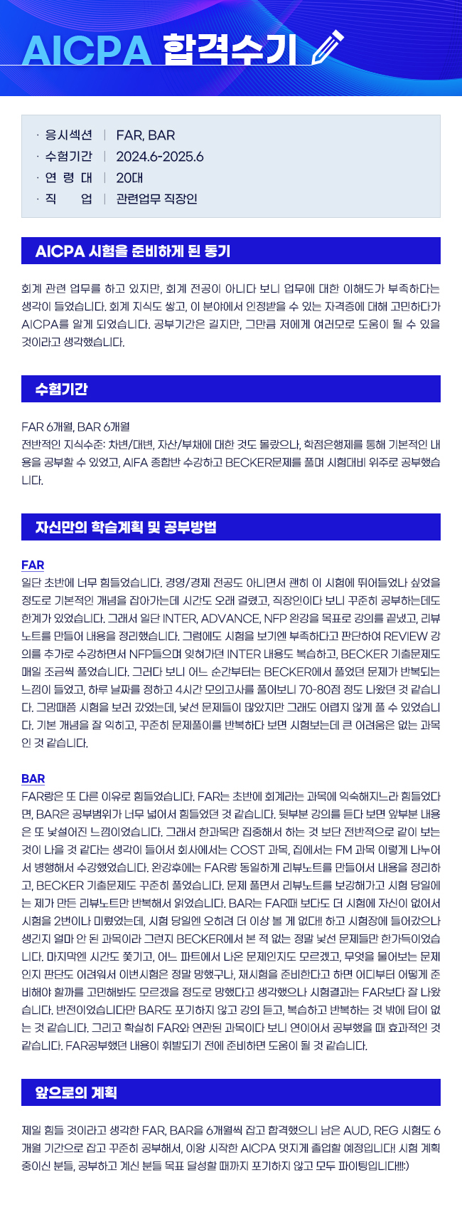 제목 [AICPA] 20대/직장인/약 1년/FAR, BAR 합격