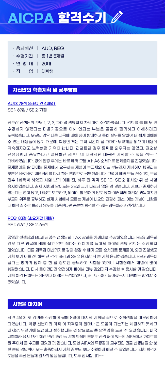 제목 [AICPA] 20대/대학생/약 17개월/AUD, REG 합격
