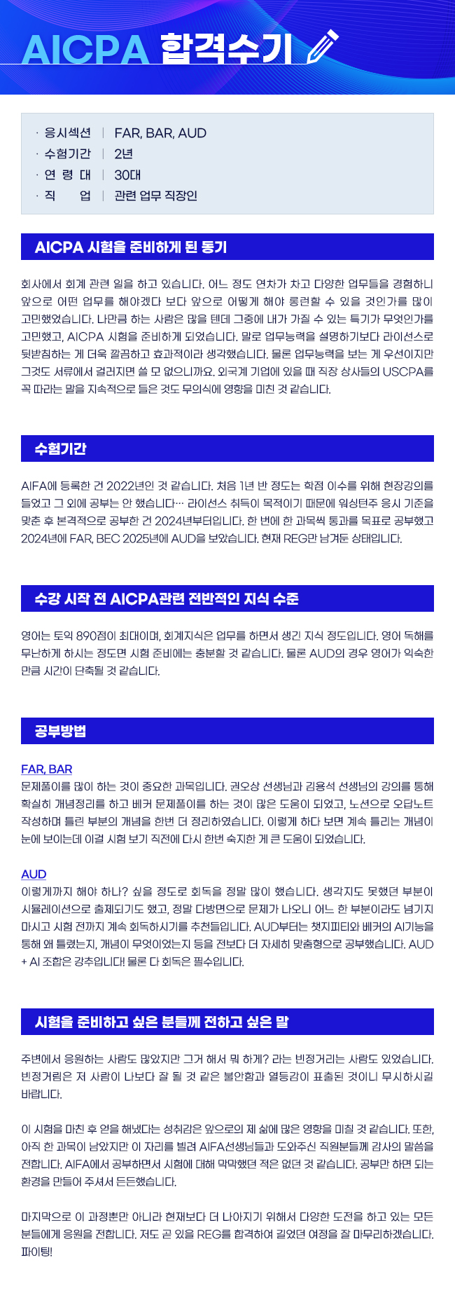 제목 [AICPA] 30대/직장인/약 2년/FAR, AUD, BAR