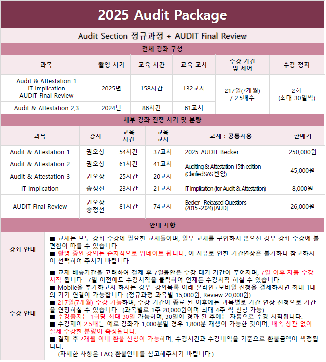 2025 Audit Package [권오상,송정선] / 2025 Audit All Lecture [권오상,송정선] / 2025 Audit & Attestation 1 [송정선][3~4월] / 2025 IT Implication [송정선][1~2월] / 2025 Audit & Attestation 1 [권오상][1~2월] / 2025 AUDIT Final Review [권오상,송정선][3~4월] / [2025 대비] 2024 Audit & Attestation 2 [권오상][3~4월] / [2025 대비] 2024 Audit & Attestation 3 [권오상][6~7월]